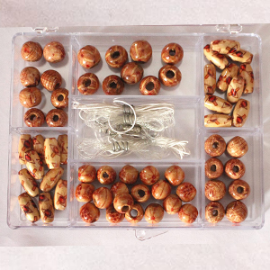 Inhalt: ca. 65 Holzperlen + Zubehör Set bestehend aus: 2m Nylonfaden, 2m Gummifaden, 3x Schraubverschlüsse, 6x Quetschkalotte