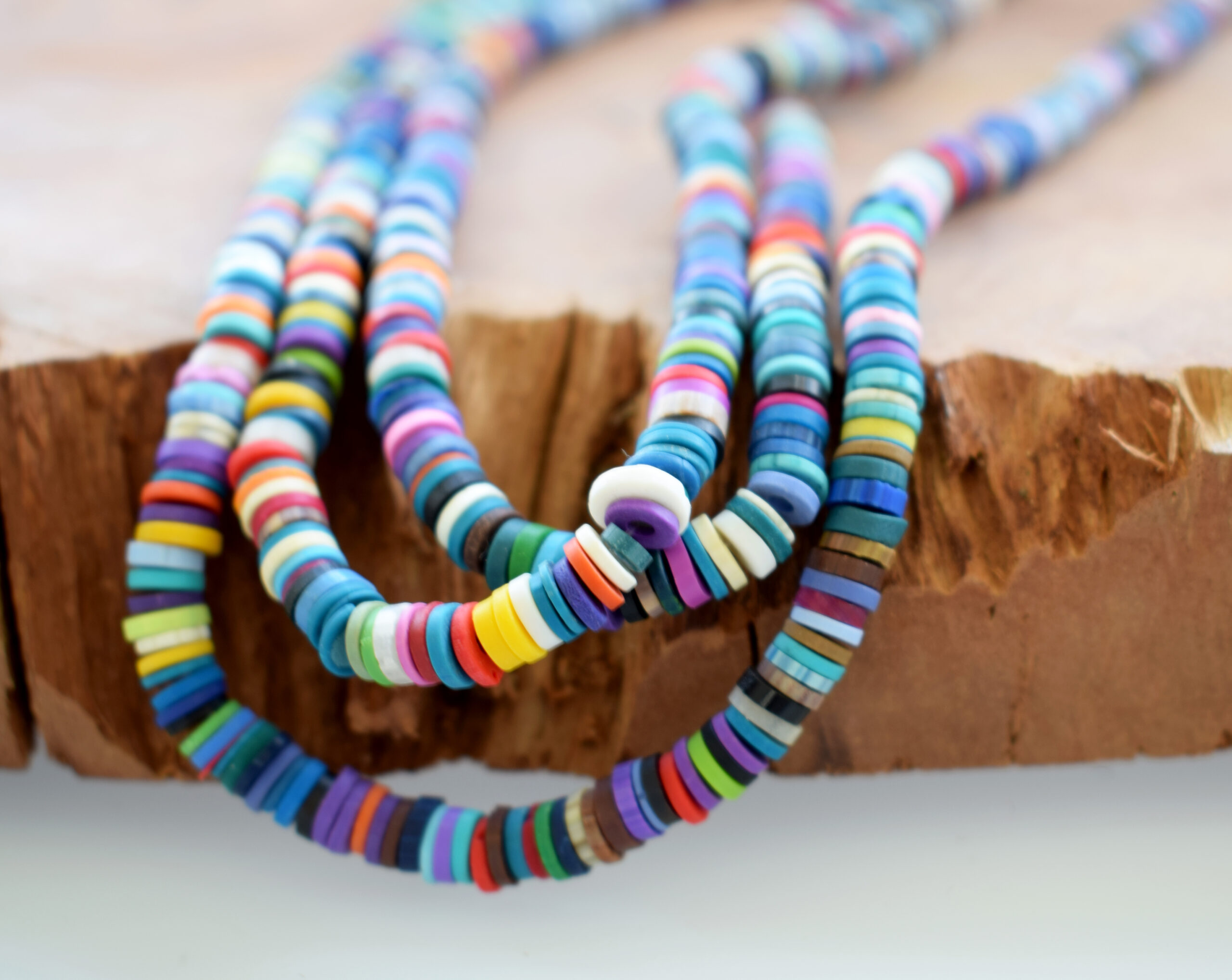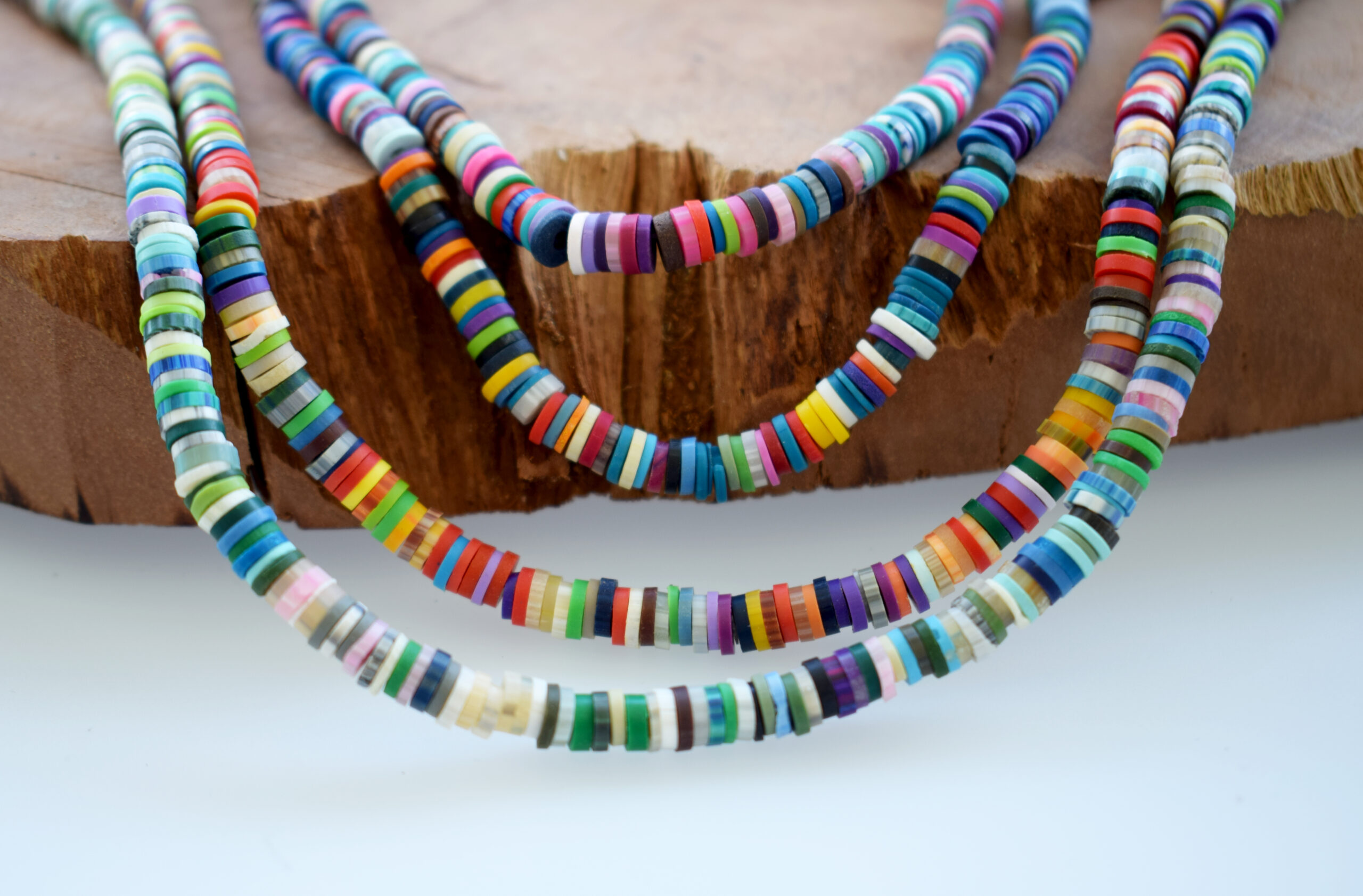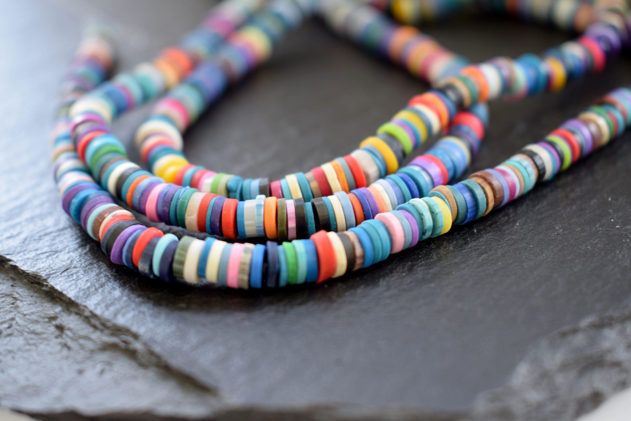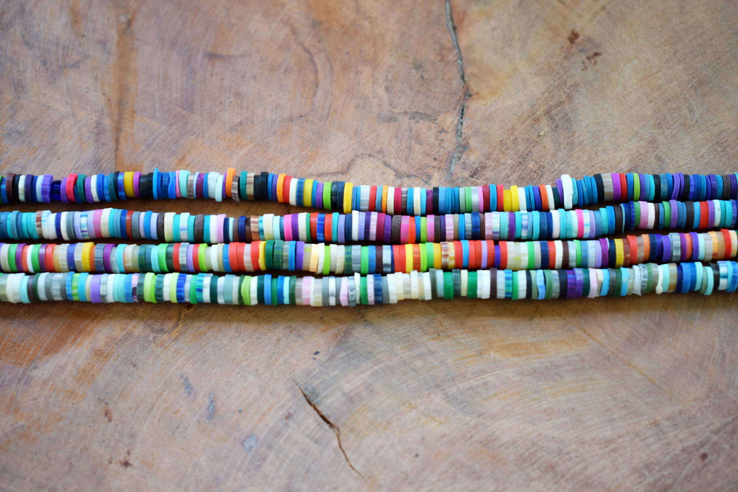 Die flachen bunten Perlen aus speziellem Polymer Clay lassen sich kinderleicht zu coolen Surferkettchen, Armbändern, Halsketten oder sogar Ringen verarbeiten.
