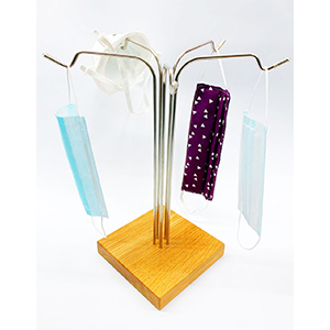 “Masken-Butler Family”, Maskenständer aus Edelstahl für bis zu 5 Masken mit Sockel aus Eiche
