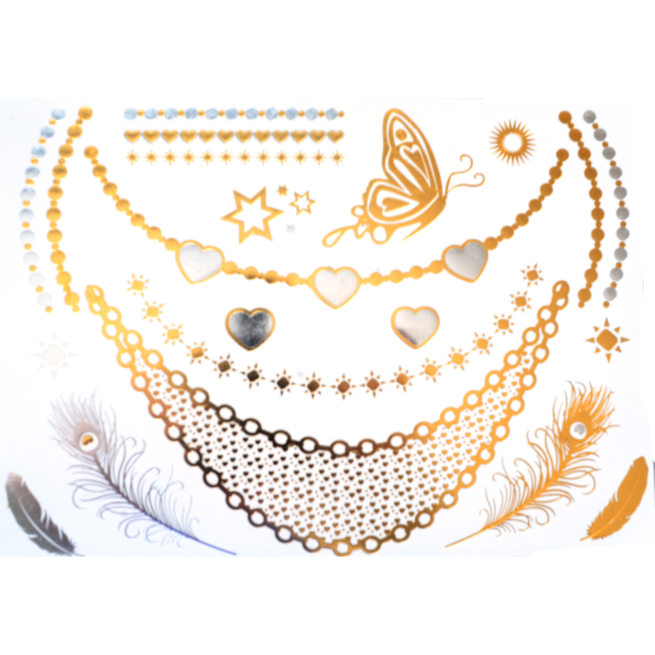 Inhalt: 1 Blatt 20x15cm mit verschiedene metallische temporäre Tätowierungen