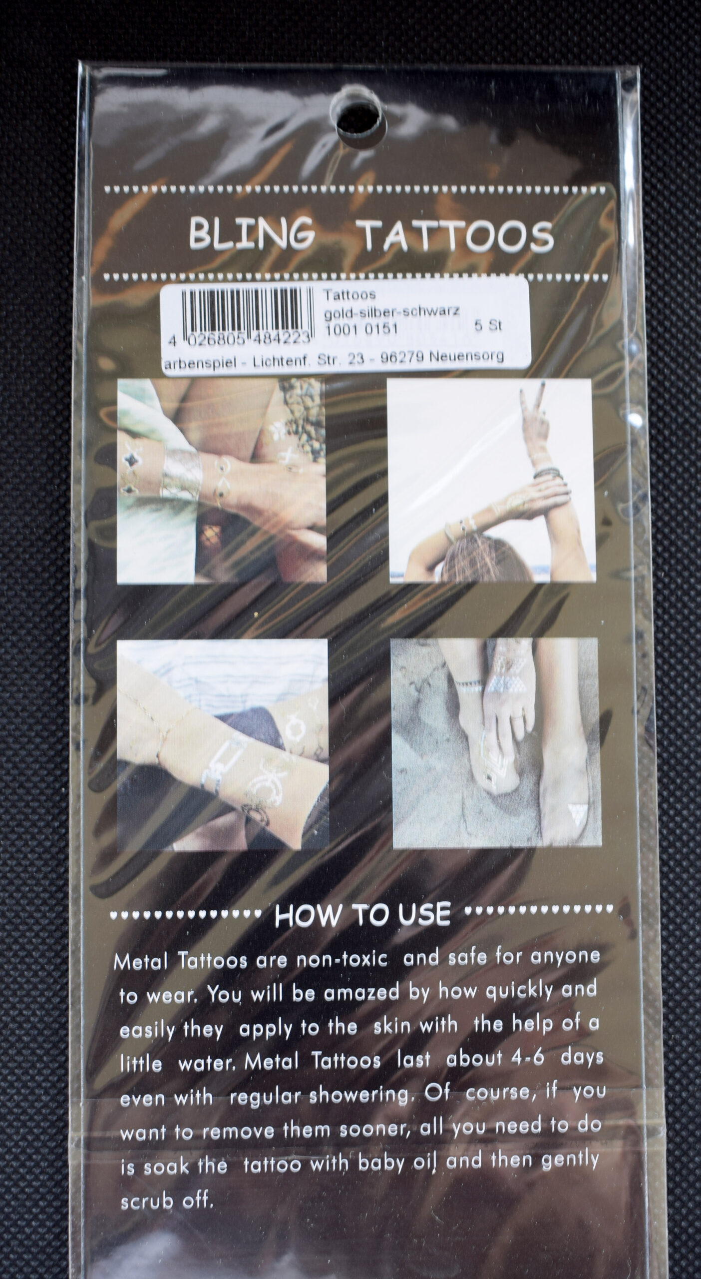 Inhalt: 1 Blatt 16x8cm mit verschiedene metallische temporäre Tätowierungen